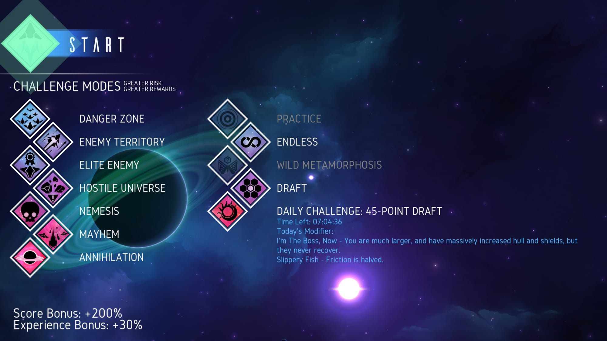Take on a new seeded challenge each day, competing with players globally. All together, there are 10 main Daily Challenges, and 23 modifiers that can be applied to them to in different combinations. This results in an enormous number of unique challenges that cycle daily.