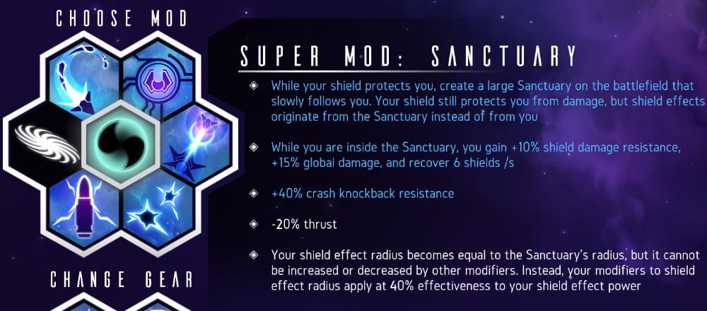 Sanctuary's former design was neither very powerful, nor was it particularly deserving of Super Mod status. The rework makes it truly transform your build. It is now the ultimate tank / point defense mod.