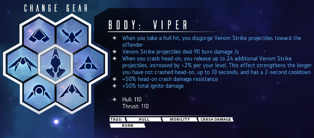 Previously, Viper's kit was wordy, convoluted, and the body wasn't very strong when compared to popular Body Gear. Now, it has been reworked to be simpler, stronger, and more cohesive. Caustic Barrier's offense has been merged with its Venom Strike ability, and its defense has been moved into its base stats.
