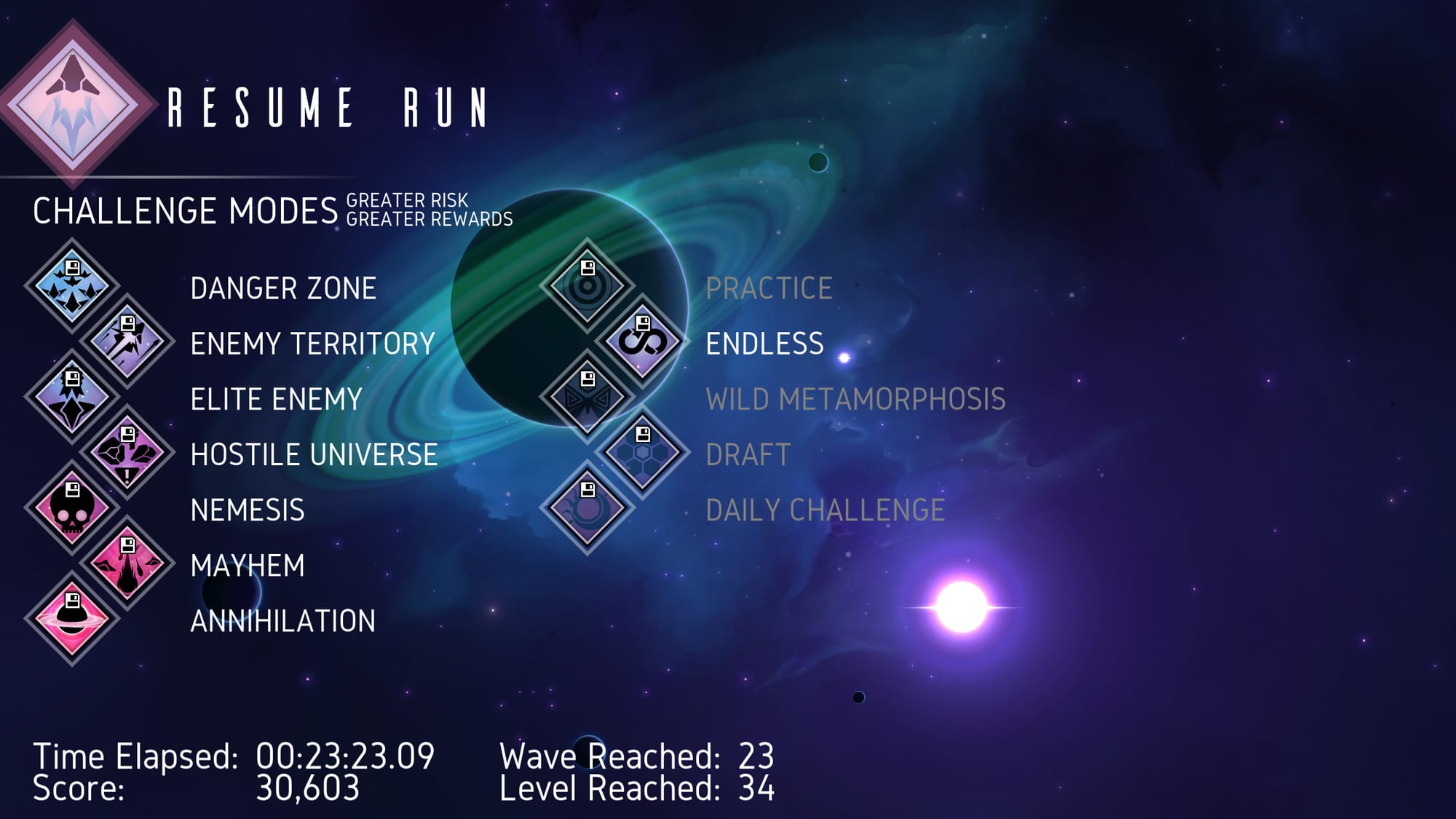 The only limitation is– since restarting the wave is naturally going to be exploitable– games where you've used this feature won't submit your score to online leaderboards. So if you're competing, you should still finish your run in one sitting, but otherwise, you can freely put games on hold.