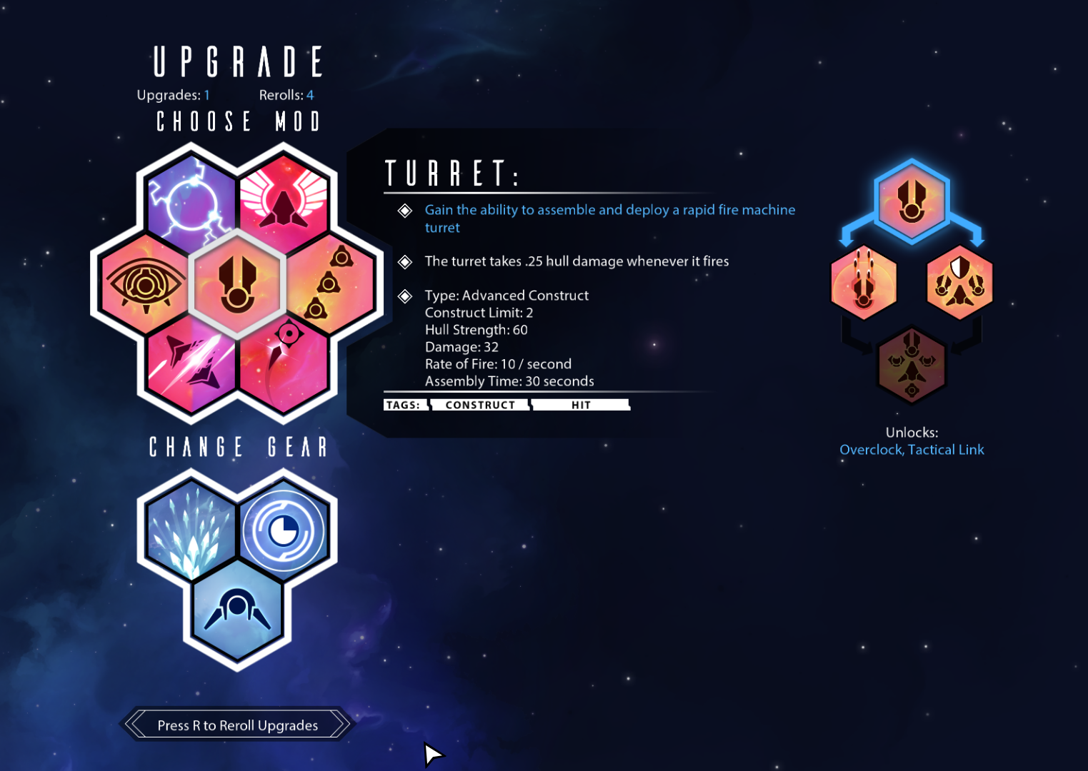Additionally, the player is offered quite a few options about how the weapon behaves. Should it sacrifice damage upfront for a blast radius? A widespread for targeting? Chaingun-style spin-up fire rate at the cost of mobility and heat damage? Charged Shot / burst fire / screen-wrap / splinter on hit? Have your weapon be employed by a drone or mines instead of you? All of these can work for or against the innate properties of any weapon.