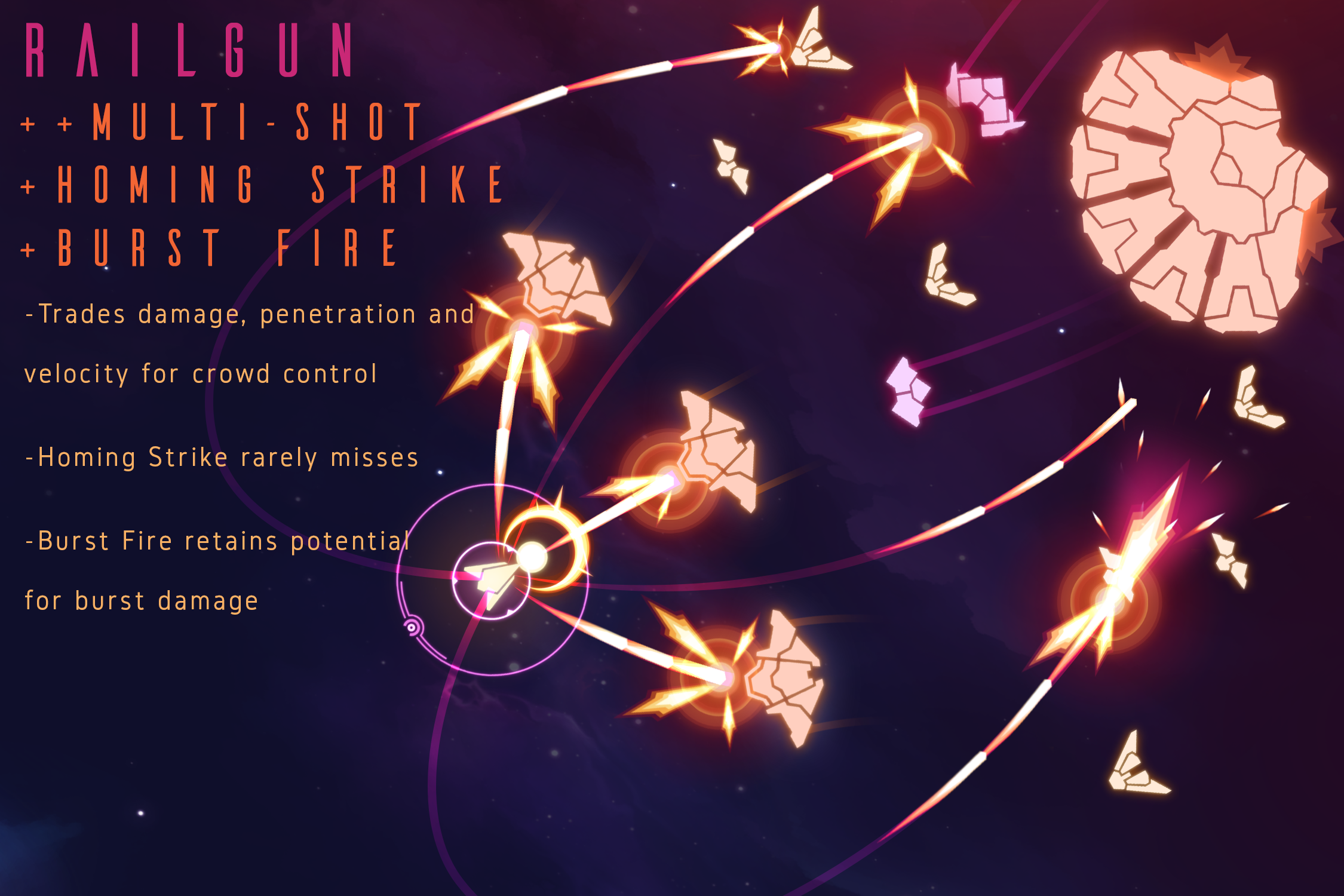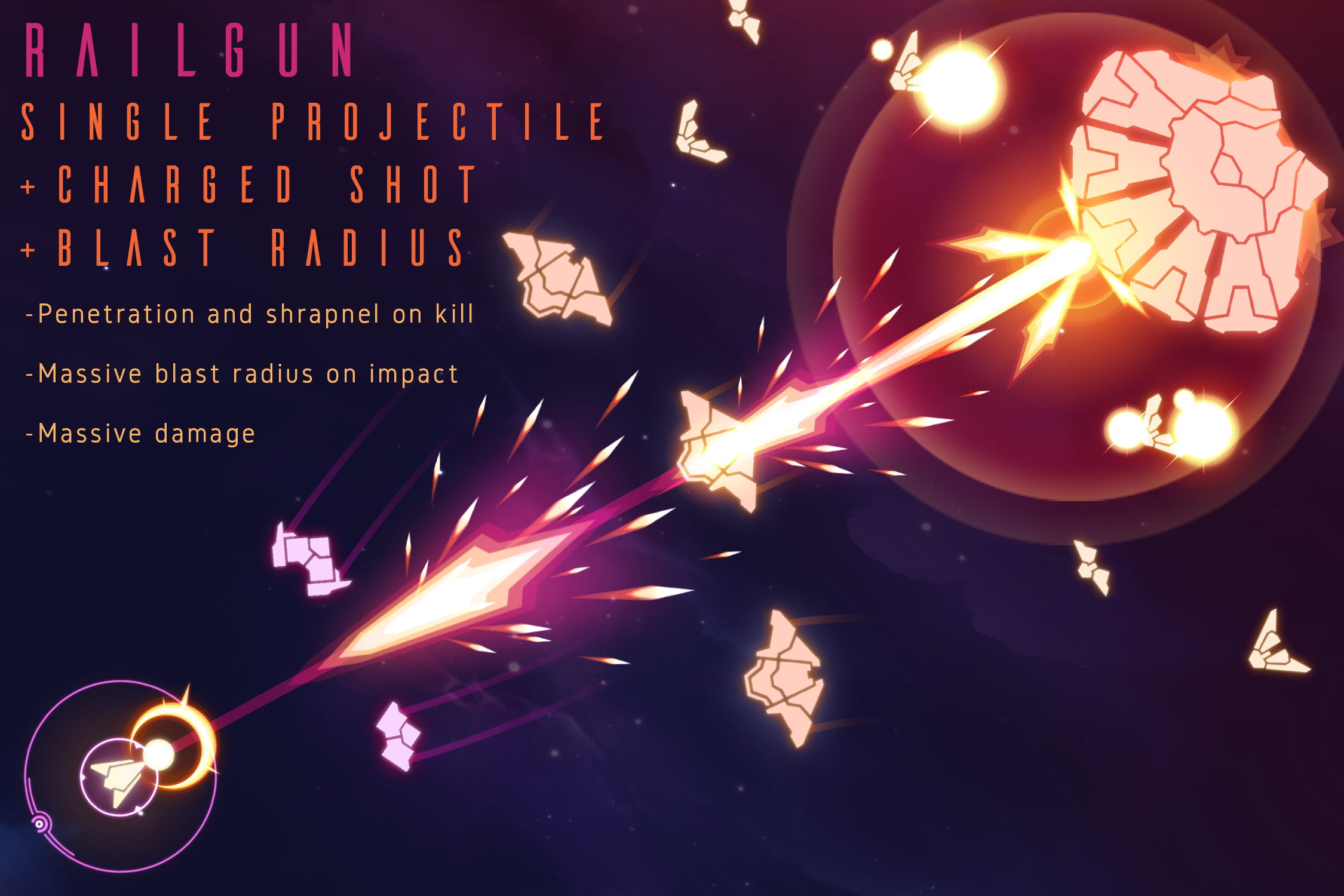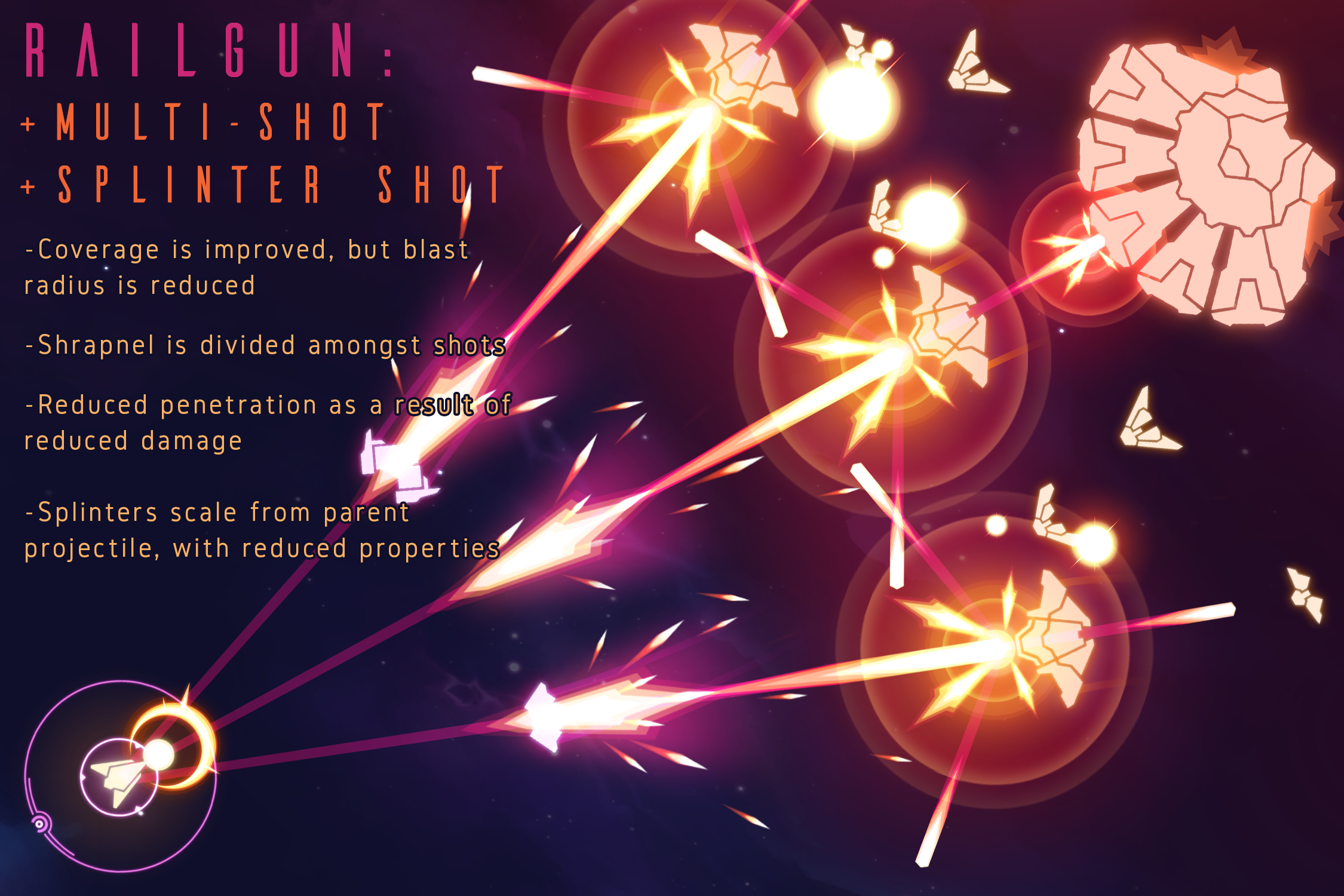 So, in my system, a Cluster Grenade which releases submunitions on detonation will spread them out across the total number of projectiles. Adding more projectiles would also reduce the initial blast and size of the projectile hit box itself. This allows the effect of multiple projectiles to be less multiplicative on your damage output, and as a result the decision leans more toward "player choice" and less toward "optimal output". Similarly, multiple Railguns results in less velocity and power, which diminishes its innate ability to penetrate targets and create shrapnel. Once these behaviors are a choice, the stage is set to provide the player with options to specialize and build within all strategies.