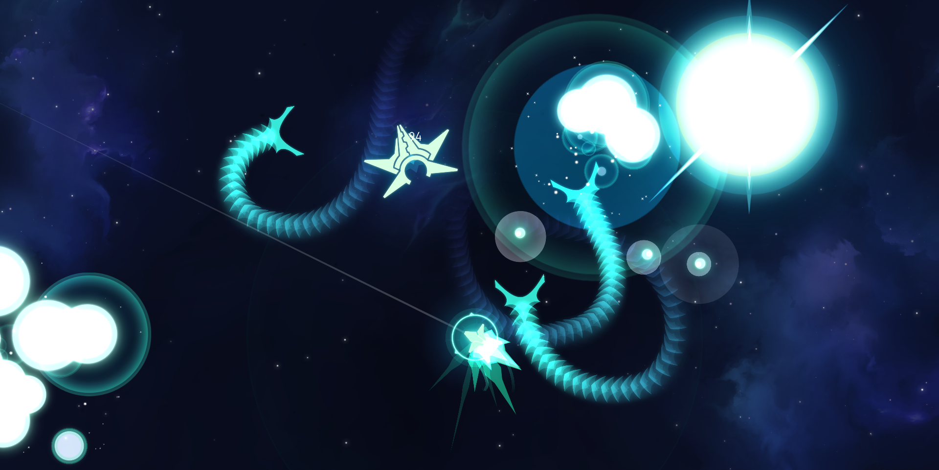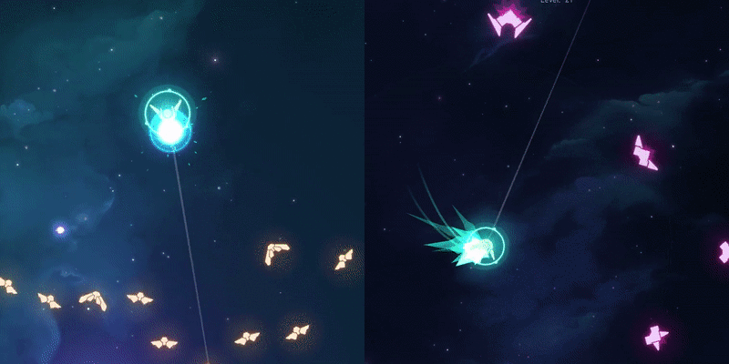 Any other non-weapon attacks (and I wanted a lot of them) had to come from either the existing buttons or triggered passive defenses (such as being hit or your shields breaking - PoE and Borderlands 2 have a wealth of great ideas for this). I challenged myself to find other ways to utilize the mechanics inherent in oldschool arcade games and apply ARPG mechanics to them. One of which is the unique movement found in "Asteroid-likes". My favorite example is a pair of modules called "Celestial Lance" and "Celestial Surge".