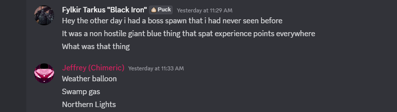 I wanted the encounter to be infrequent enough that seeing it was actually insane, but not so uncommon that long time veterans never saw it. Estimating play time, my friend and I tried to make it so that you'd be likely to see it once every few hundred hours. My plan was that it'd be just rare enough that players couldn't be sure whether evidence was doctored. After all, the art had existed in the game files quite a while before anyone captured it in a screen shot. This was of course unsustainable as video evidence did eventually appear, but by the time it did, we were way past the truth mattering. I'd just claim the video wasn't playing or that Discord was busted.