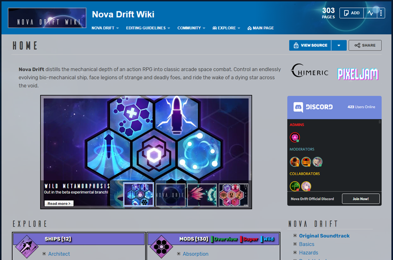 I'd like to shout out the community's work on the amazing Nova Drift wiki. With over 300 pages, comprehensive content, and a sharp new design, it is truly something to be proud of! Special thanks to Jim-bot, Haru, Peetrrovv, Pixelstormer, Silical, Vogelspin, and everyone else for your contributions.