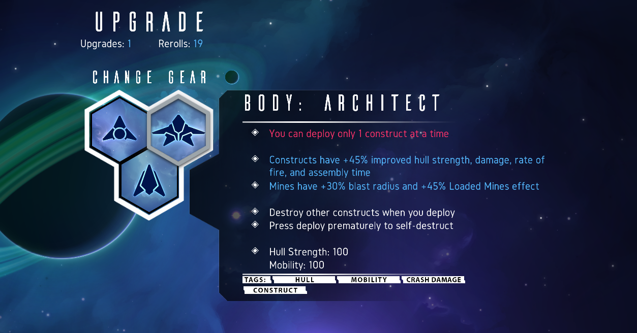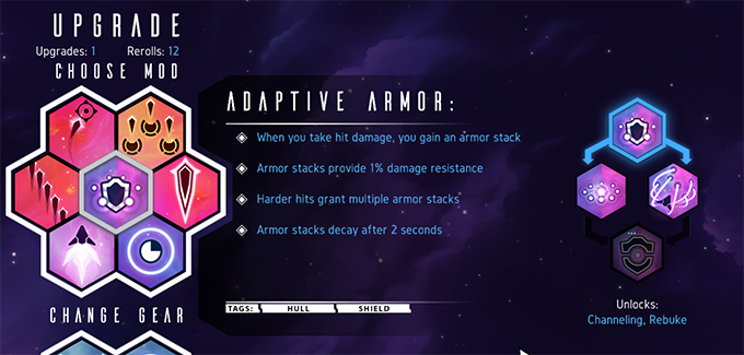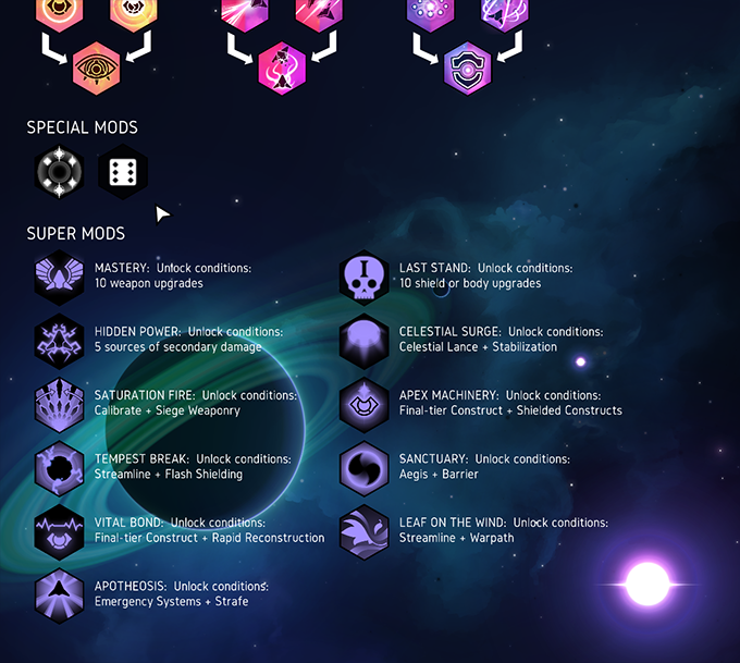 Once unlocked, they appear in your mod pool when certain conditions at met. The conditions for each mod are different. For example, Leaf on the Wind causes your ship to become very small and provides a ramping damage buff the longer you avoid taking any damage to your hull or shields. The mod will appear in your mod pool if you have purchased the Streamline and Warpath mods.